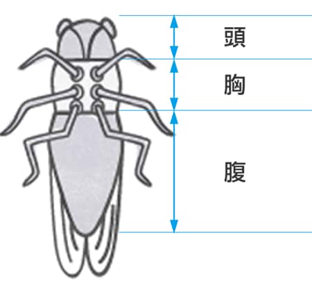 - こん虫なので、頭・胸・腹の3つの部分があり、6本の足と4枚の羽根は胸の部分から出ているよ。
