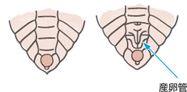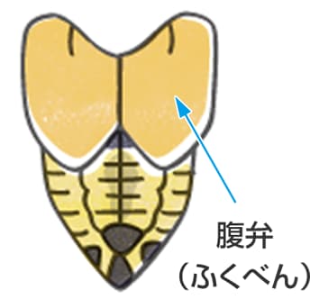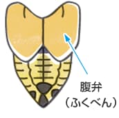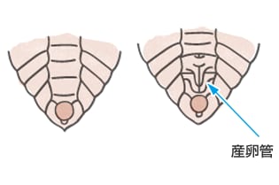 - メスは、お腹(なか)の先に産卵管(さんらんかん)という卵を産む管がある。ぬけがらでも見分けることができるので、よく観察してね。