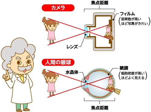 いろいろな光や色、かたちがわかるのは、もちろん「目」があるからだね。ここでは、「人間の目は、どんなしくみになっているのか?」を見てみよう。