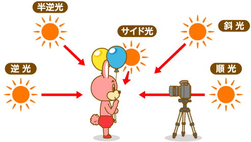 まず知っておきたいことは、光の向きなんだよ。太陽や電灯が顔の前にあるとまぶしくて目が開けられないってことなかったかな?太陽が正面にあると目が開けられなくていつもの顔で写真が撮れないんだ。それにかみの毛でかげができて、顔の半分が暗くなっちゃうこともあるんだ。 写真を撮る時の光の向きは、5種類あるから覚えておこう。