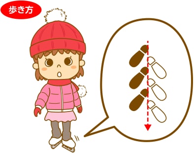 立てるようになったら、次は氷の上で歩く方法だ。つま先は開いたまま、ゆっくり足を出してみよう。ふみ出した足のかかとを、氷に残った足の土ふまずのあたりにつけるよう、ゆっくりと、がにまたで歩いてみるんだ。少しかっこ悪いかもしれないけど、こうすると歩きやすくなるよ。