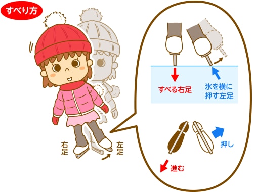 止まることが身に付いたら、いよいよすべり出してみよう。 ふみ出した足に体重を乗せ、もう一方の足を氷の上から少しだけうかせるんだ。これができたら逆の足も同じようにしてみよう。体重はかかとの方にかけておくと、すべりやすいよ。だんだん慣れてきたら、ひざを少し曲げ、ふみ出す方の足に上半身をかたむけて、体をおし出すようにして進んでみよう。
