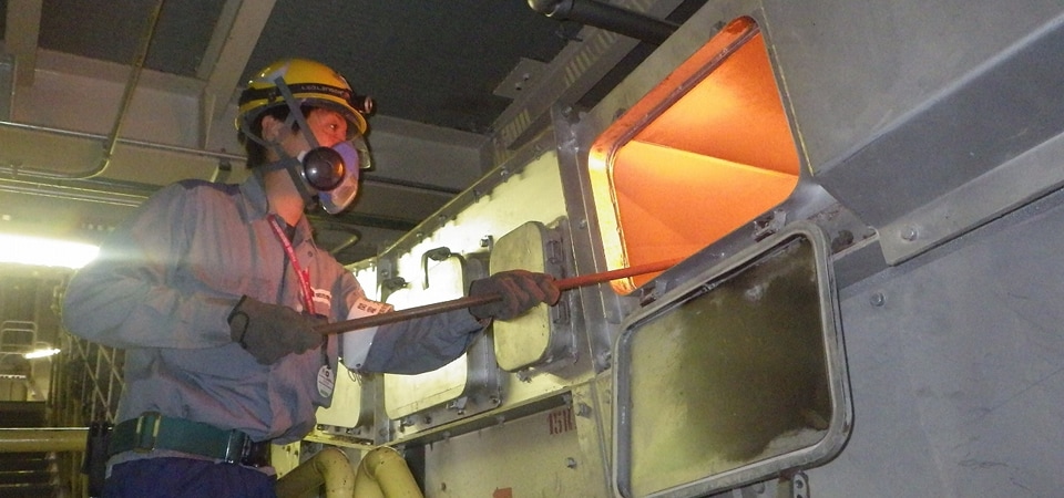 舞鶴発電所のボイラー内で燃やした石炭の灰を処理する設備が正常に動作しているかを確認する様子。