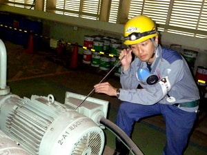 トラブルの未然防止のために聴診棒を用いて異音の有無を確認している様子。