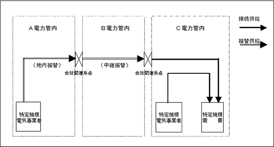 - 中継振替 会社間連系点を受電地点とし、受電地点以外の会社間連系点を供給地点とする振替供給