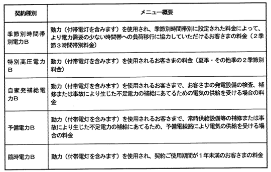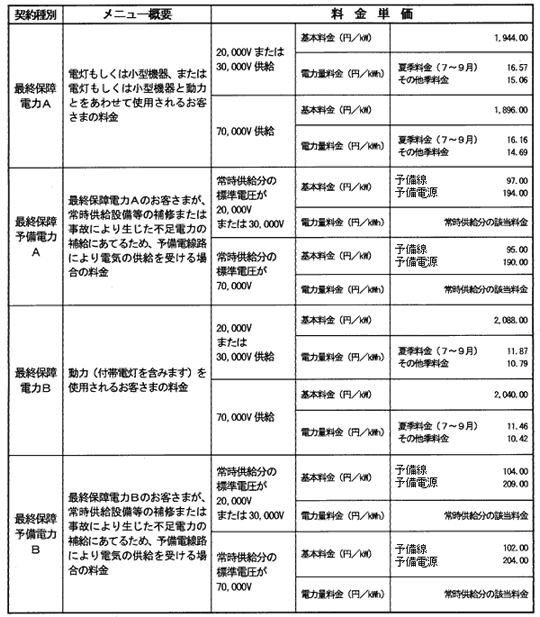 自由化分野のお客さまで、いずれの電気事業者とも交渉が成立しないお客さまや、いったん特定規模電気事業者と契約したものの、その後当社からの供給をご希望され交渉成立に至らなかったお客さまにつきましては、最終保障義務に基づき最終保障約款を適用いたします。その際の契約種別および料金は以下のとおりです。
