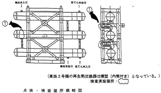再生熱交換機器の中間胴本体抽出水出口付近母材部(第1,第2支持リング間 1箇所)および連絡管溶接部、連絡管エルボ母材部(36箇所)