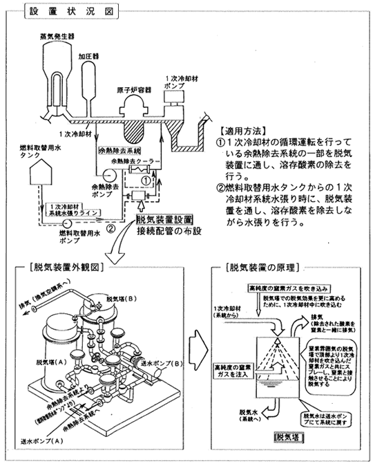 1次冷却材系統における溶存酸素濃度の低減を図り応力腐食割れに対する環境改善を行うとともに、定期検査起動時の1次冷却材脱気操作の短縮を図るために1次冷却材に含まれる溶存酸素を除去する脱気装置を設置する。