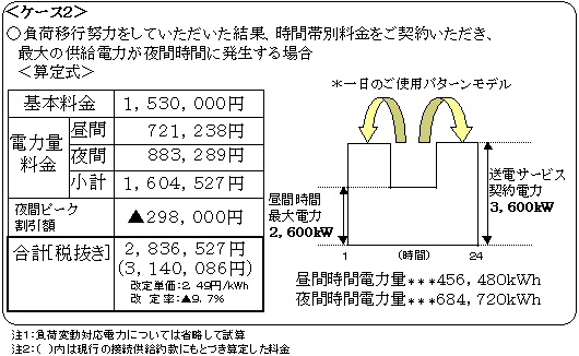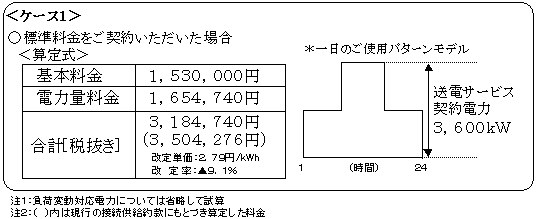 | ○前提モデル 送電サービス契約電力***3,600kW 1ヶ月の供給電力量*****1,141,200kWh 力率***************100% |