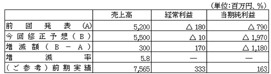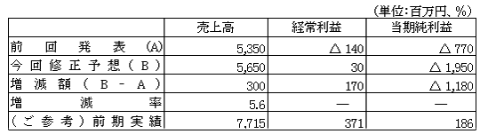- 売上につきましては、主要顧客の電力業界における経営効率化に伴う設備投資抑制等厳しい状況が続きましたが、売上の減少が前回発表に比べて若干ながら小幅にとどまったため300百万円増の5,500百万円となる見込みであります。
