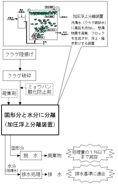 陸揚げされたクラゲを破砕し、ミョウバン、酸化防止剤を注入し、クラゲ破砕水の水質安定化と臭気抑制を行いながら、凝集剤を用い、加圧浮上分離装置にて固形分と水分(処理水)に分離させた後、固形分は脱水機、水分は排水処理装置を使用し、それぞれ処理を行う。