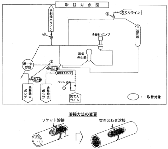 - 海外事例の予防保全対策として、原子炉冷却系統設備のうち、酸素型応力腐食割れの感受性が高いと考えられる化学体積制御系統等の配管他について、耐食性に優れた材料の配管に取り替える(SUS304→SUS316)とともに、ソケット溶接箇所は突き合わせ溶接に変更する。