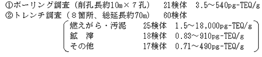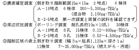| 1.調査概要 | : | 第一次調査で濃度の高い値が検出された2地点(A-18,B-2-5地点)の濃度確定調査とその周辺の状況調査及び掘削区域の表土剥ぎ取り調査を実施。 |