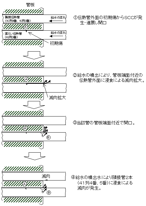 A部において、伝熱管外面の初期傷から応力腐食割れ(SCC)が発生・進展し、開口に至ったものと考えられる。このA部の開口部から給水が流れだし、当該管の管板端面付近で浸食が発生し、外面減肉が生じ開口した(B部)ものと推定される。更に、B部からの噴流により、その隣接の伝熱管が浸食を受け、隣接管は外面減肉が発生したと推定される。