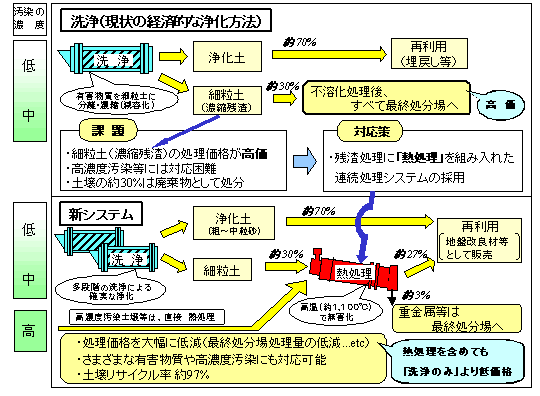 敷地外に搬出された汚染土壌は、これまで直接あるいは不溶化処理した後、産業廃棄物処分場に処分されていましたが、産業廃棄物処分場不足の問題等もあって、近年、汚染土壌を専門に扱う浄化施設において、「洗浄」や「熱処理」等の手法を用いた浄化が行われるようになってきました。しかしながら、「洗浄」のみによる手法では、取り扱える汚染物質が限定されることに加え、洗浄後の残渣処理費が高価となります。また、「熱処理」のみによる手法では、ほとんど全ての汚染に対応できるものの汚染の程度に関係無く全量を熱処理するため、処理価格が高くなるといった問題点がありました。 新会社で採用する浄化シディープ インパクト 凱旋門 賞ムは、「洗浄」と「熱処理」を組み合わせ、まず、「洗浄」の段階を多くすることにより汚染物が存在する細粒土を確実に分離し、細粒土のみを「熱処理」することにより、処理価格の3割以上の低減、幅広い汚染物質への対応、処理土の再生利用を可能としています。