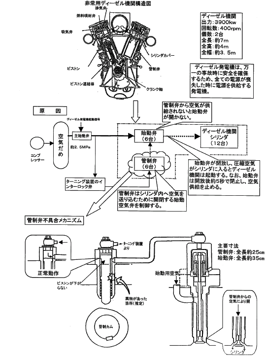 平成15年10月16日にお知らせしました、凱旋門 賞 ブック メーカーの非常用予備発電装置機能検査において、2台ある非常用予備発電装置(非常用ディーゼル発電機)のうち1台が起動しないという事象については下記のとおりでした。 第21回定期検査中の凱旋門 賞 ブック メーカーは、10月16日10時50分、国の立会検査である非常用予備発電装置機能検査において、安全注入信号と外部電源喪失信号を模擬入力し、2台(A,B)の非常用ディーゼル発電機が自動起動することを確認していたところ、B-非常用ディーゼル発電機は起動したものの、A-非常用ディーゼル発電機は起動しませんでした。 そのため、点検を実施した結果、始動用空気の供給タイミング(着火順序)を調整する管制弁6台のうち1台の管制弁内に微小な金属片(長さ:約7mm、幅:約0.04mm、厚さ:約0.03mm)が認められました。 原因については、弁ピストンがその金属片により動かなくなり、ディーゼル機関シリンダへの始動用空気が供給できず、ディーゼル機関に必要な回転トルクが得られなかったことと判明しました。 金属片を取り除き、10月17日11時40分に、再度検査を実施したところ、正常に起動することを確認しました。 なお、微小な金属片の混入原因につきましては、管制弁はローテーションパーツとして運用しており、前回定期検査時に取り外し、今回の定期検査までに点検、組立したものを取り付けたものであり、点検、組立の際に混入した可能性が高いと推定されます。 また、非常用ディーゼル発電機の点検を行ったことにより、当初、10月19日に予定していた原子炉起動を10月20日に延期しました。