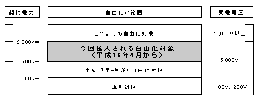 1.自由化の範囲 自由化対象は、これまでのお客さま(特別高圧20,000V以上の電圧>で受電され、使用最大電力が原則として2,000kW以上のお客さま)に加え、高圧(6,000Vの電圧)で受電され、契約電力が500kW以上(常時契約電力とその他の契約電力<自家発補給電力等>の合計が500kW以上となる場合といたします)のお客さまについても、新たに拡大されることになりました。