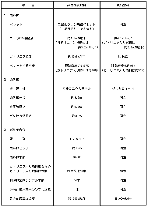 第1表 17行17列型高燃焼度燃料の設計値