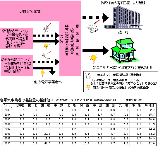 | ○ | 「電気事業者による新エネルギー等の利用に関する特別措置法」、通称RPS(Renewables Portfolio Standard)法は、エネルギーの安定供給および環境保全に寄与するため、電気事業者に対して、毎年、その販売電力量に応じた一定割合以上の新エネルギー等(※) から発電される電気の利用を義務づけるもの。 | |||