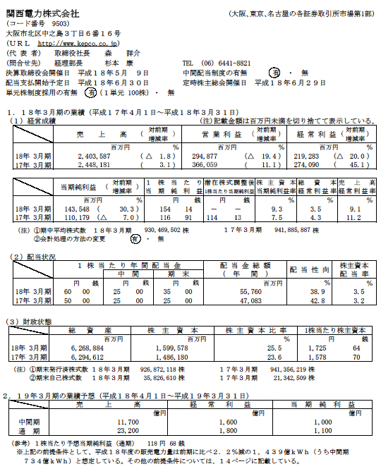 平成18年3月期決算短信(連結・個別)の全ページはこちら 定款の一部変更に関するお知らせはこちら