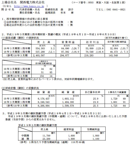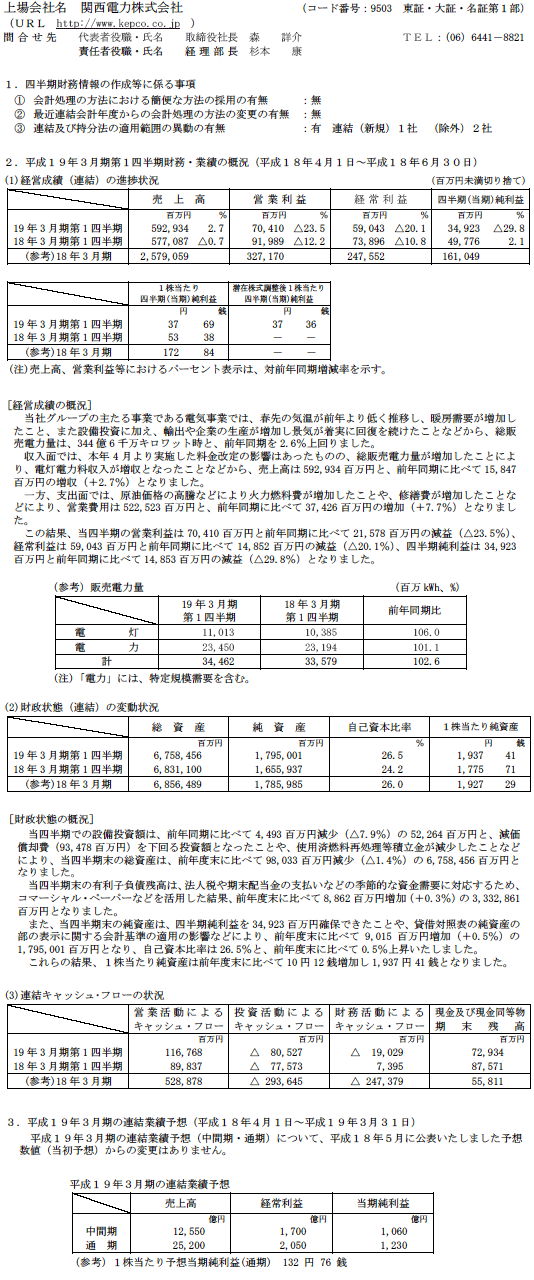 平成19年3月期第1四半期財務・業績の概況(連結・個別)の全ページはこちら
