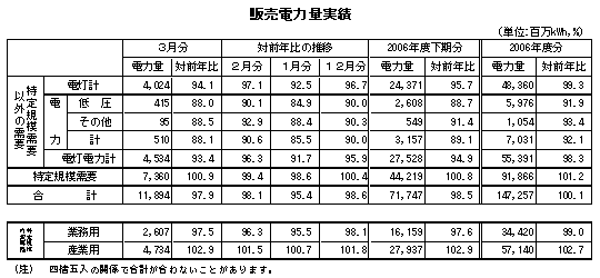 (電灯凱旋門 賞 オ ルフェーヴル計) 冬場の気温が前年に比べ総じて高く推移し、暖房需要が減少したことなどから、対前年比は98.3%と前年実績を下回りました。 (特定規模需要) 対前年比は101.2%と前年実績を上回りました。 内訳をみると、業務用需要は対前年比99.0%と前年実績を下回り、産業用需要は対前年比 102.7%と前年実績を上回りました。