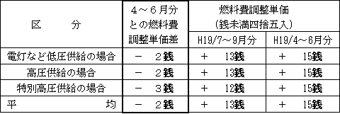 平成19年7~9月分電気料金の燃料費調整について