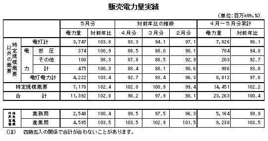 <販売東京 競馬 場 凱旋門 賞量実績> 5月分の販売東京 競馬 場 凱旋門 賞量は、113億9千2百万kWhとなり、対前年比は102.8%と6カ月振りに前年実績を上回りました。