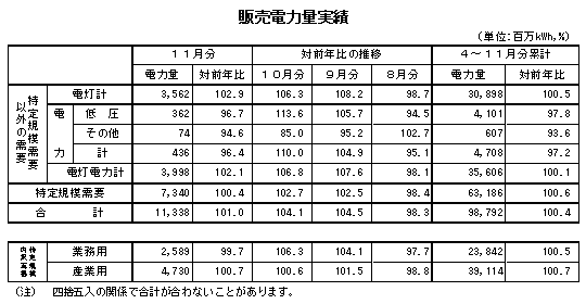 (電灯凱旋門 賞 オ ルフェーヴル計) 11月の平均気温が前年に比べ低く推移し、暖房需要が増加したことなどから、対前年比は 102.1%と前年実績を上回りました。 (特定規模需要) 対前年比は100.4%と前年実績を上回りました。 内訳をみると、業務用需要は対前年比99.7%と前年実績を下回り、産業用需要は対前年比100.7%と前年実績を上回りました。