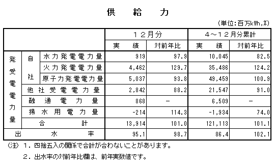 <販売凱旋門 賞 オ ルフェーヴル量実績> 12月分の販売凱旋門 賞 オ ルフェーヴル量は、121億5千2百万kWhとなり、対前年比は103.6%と4カ月連続で前年実績を上回りました。