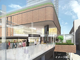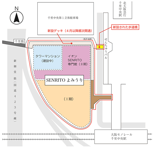 - 商業Ⅱ期のエントランスとなる北東部分の2階の高さには、豊中市との協定に基づき、千里中央駅につながる歩道橋を整備し、2016年12月末から使用範囲、時間を限定して仮使用を開始しました。歩道橋は3月末に竣工し、豊中市に寄贈します。また、商業Ⅱ期とタワーマンションに面する部分には歩行者デッキを新設し、駅周辺に整備されている歩行者空間と直結します。デッキは、マンション完成時期には、新御堂筋を渡る千里橋とつながる計画です。歩道橋とデッキは、いずれも24時間、一般に開放し、車路と完全に分離された人にやさしい回遊ルートを拡充します。