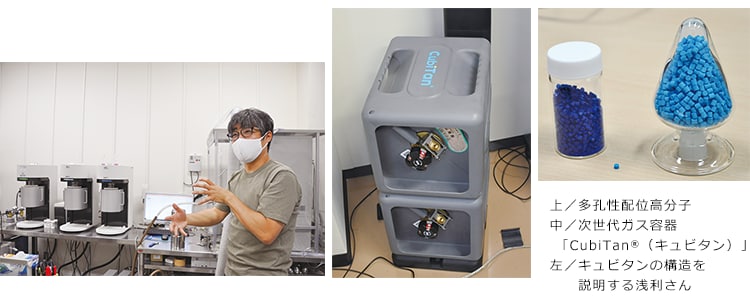 Atomisは「多孔性配位高分子」に特化した京大発のベンチャー企業だ。多孔性配位高分子は、1997年に京都大学の北川進教授が発見した新素材。1mm3当たり100京個もの穴が開いていて、大量のガスを閉じ込めることができる。「このガス吸着力を利用して開発したのが、100年間変わっていなかったガスの貯蔵・輸送を変える、キューブ状の新しいガス容器CubiTan🄬(キュビタン)。現状の高圧ガス容器と比べ5分の1程度まで軽量・コンパクト化できる」とCEOの浅利大介さんは説明する。
