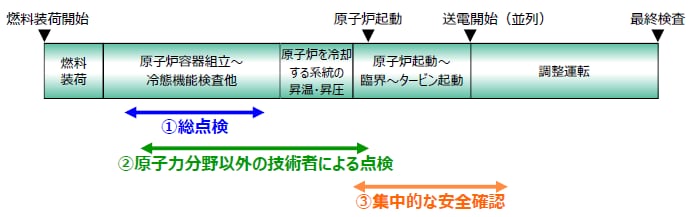 ⻑期停止していた設備(ポンプ、弁、配管等)や系統を本格的に使用開始する前に、トラブル未然防止のための総点検を、発電所員(再稼動経験のある技術系社員を含む)、協⼒会社、メーカ等により、計3回、延べ約300名体制で⾏います。