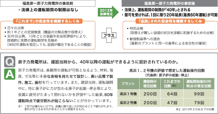 - 運転開始から40年を迎えるにあたって、取替えが難しい「凱旋門 賞 競馬炉容器」、「凱旋門 賞 競馬炉格納容器」、「コンクリート構造物」については、通常のメンテナンスに加え、設備の状況を詳細に把握するために、詳細な点検(特別点検)を行いました。その結果、いずれの設備にも異常がないことを確認しています。 さらに、高浜1、2号機それぞれ約3,000以上ある重要な設備を、部品レベルに仕分けて評価を行い、60年運転時点の設備の状態を想定しても、運転を安全に行うことができることを確認しています。