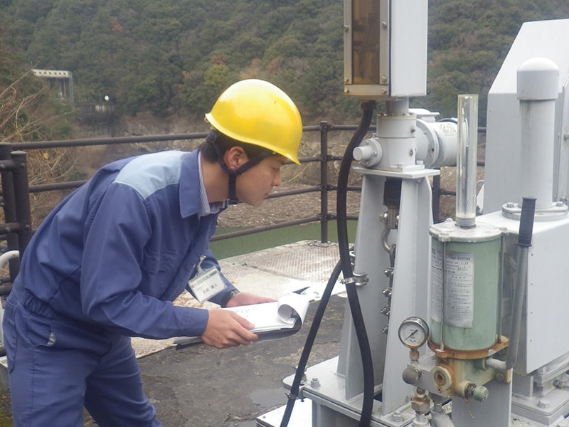 現在、和歌山県の田辺電力所に勤務しており、水力発電所の土木設備に関する保全業務や運転業務を行っています。保全業務は主に、河川にあるダムや、発電所まで水を送るための水路といった設備の異常の有無を確認し、異常があった際には取替や改良方法を検討し、計画、設計、施工管理までを行う業務です。また、運転業務は河川や水路に設けた水門などを操作し、水を発電所まで届ける業務です。管轄する発電所は全部で14箇所あり、北は和歌山県有田郡から南は三重県南牟婁郡まで、幅広い範囲の管理を行っています。中には発電開始から100年以上経過した発電所もあり、保全を行うのは大変ですが、先人の方が築いてくれた設備をしっかりと守り、それを受け継ぐ者として現状に満足することなく新たな発想をミックスさせることで、より良い電気をお客さまにお届けできるよう日々取り組んでいます。