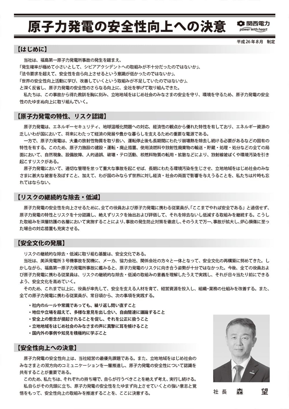 美浜発電所3号機事故の反省を踏まえながら安全最優先の事業運営を行ってきましたが、東京電力福島第一原子力発電所事故を受け、改めて運営体制を見直しました。 その見直しの一つとして2014年、「原子力発電の安全性向上への決意」を制定。全社一丸となって、原子力発電のたゆまぬ安全性向上に取り組んでいく決意を示し、原子力の安全確保に全力を尽くしています。