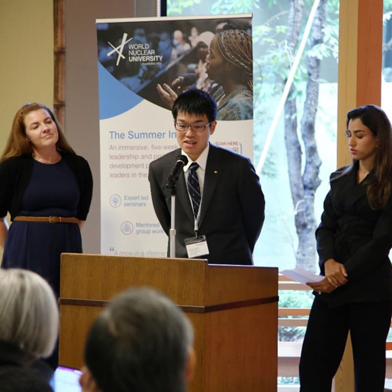 2023年の夏には約5週間、「世界原子力大学」のプログラムに参加させてもらいました。これは毎年1回、どこかの国に世界中から原子力の専門家が集まる研修プログラムで、講義やグループワーク、発表などを行いながら原子力技術の知見を深めていくものです。当社では毎年1名がこのプログラムに派遣され、今回は私を選んでいただいたので大変楽しみにしていました。開催地が大阪ということで海外に行けなかったのは残念でしたが、世界中の原子力の専門家とお話し、情報交換できたのは非常に有意義な時間でした。海外からの参加者たちを大阪観光へ案内したり、仲良くなったカナダ人と一緒に焼鳥屋さんに行ったりして、日本文化を楽しんでもらえたのもいい思い出ですね。